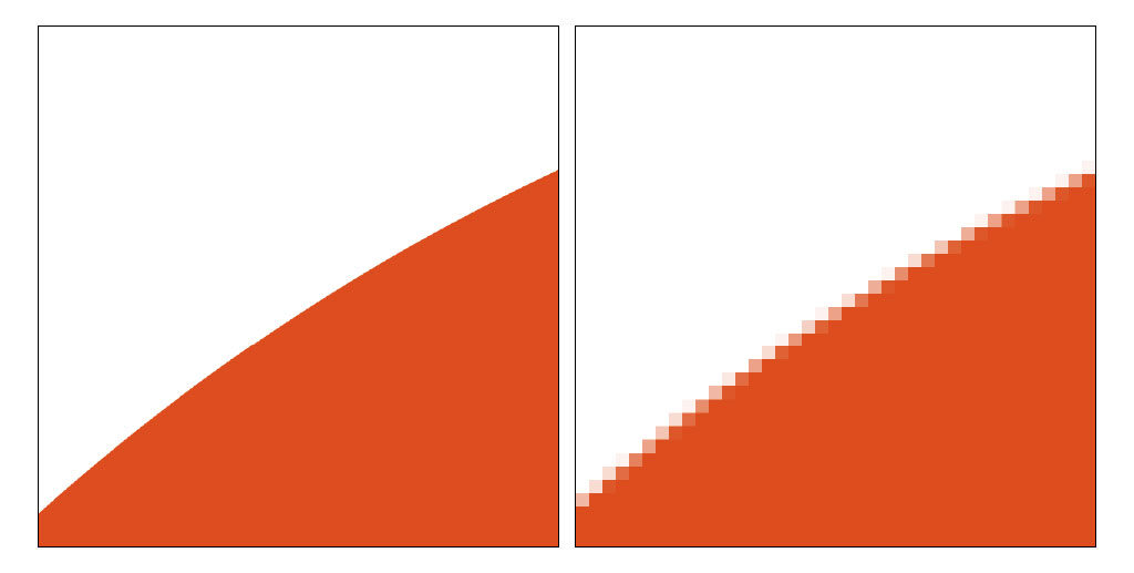 ※左はベクトル画像を拡大したもの、右はビットマップ画像を拡大したものです。