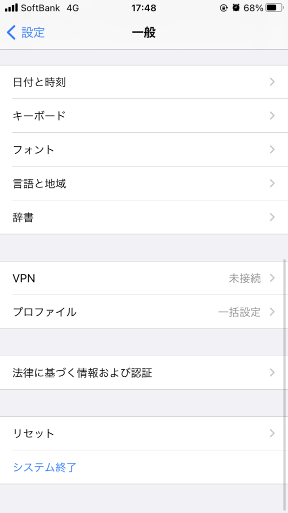 ①設定アプリを開いて「一般」→「VPN」をタップ