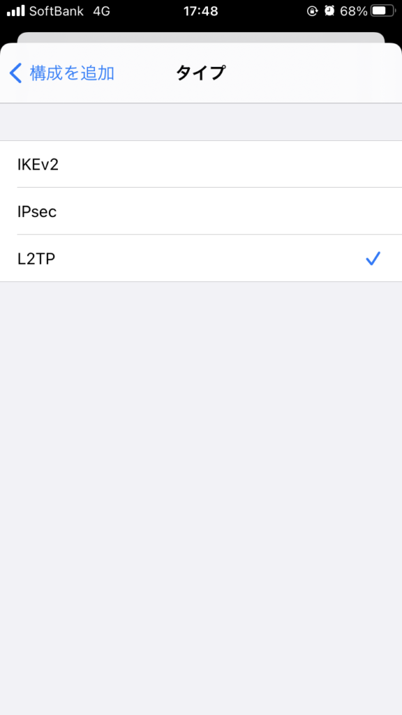 ④「タイプ」をタップして「L2TP」にチェック