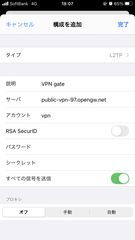 ※ パスワードとシークレットの部分にも、アカウント同様「vpn」と入力してください。