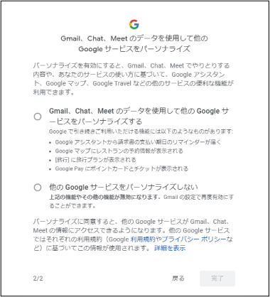 この画面では、GmailやGoogle Chat、Google Meetのデータを、GoogleマップやGoogle Playなどの他のGoogleサービスに利用してよいかという確認画面になります。
