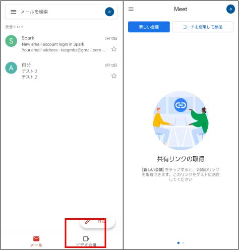 ※下図左側のようにGmailのアプリ内でMeetを開始することもできますし、右側のように単独でMeetアプリを起動して使うこともできます。