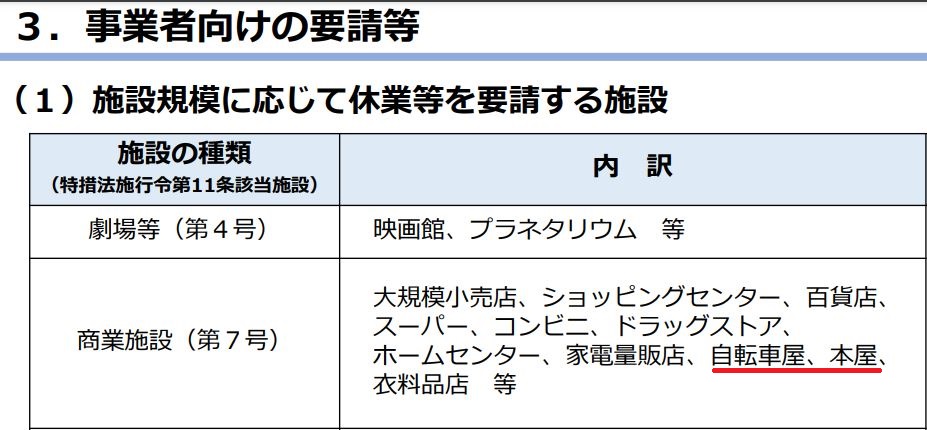 都によると、この 「自転車屋」「本屋」 などは「商業施設(第7号)」の内訳を示しただけで、休業要請の対象ではないそうです。