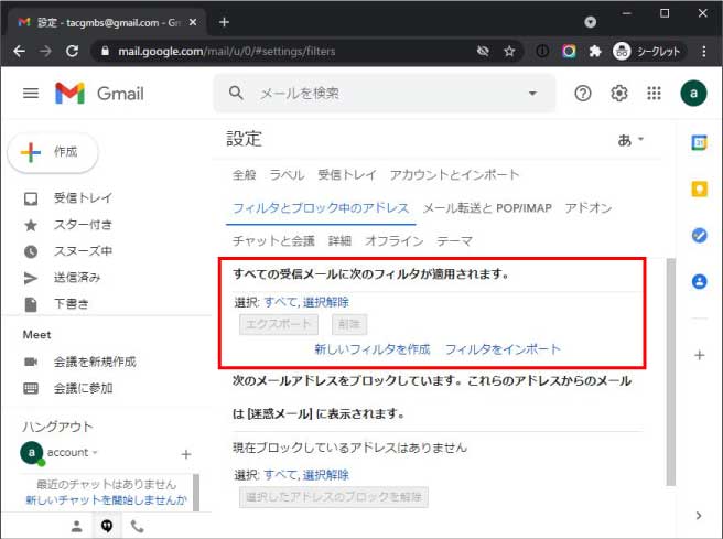 ②「フィルタとブロック中のアドレス」→赤枠に不要なフィルタ項目があれば削除をします。