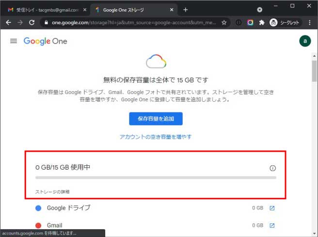 一つのGoogleアカウントに割り当てられているストレージ(容量)は、無料版の場合15GBです。これはGoogleドライブやGoogleフォトなどのストレージも共有しているので、それらの合計が一杯になっているとメールが受信できません。
