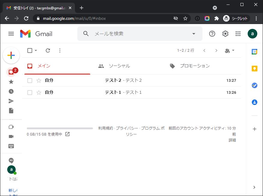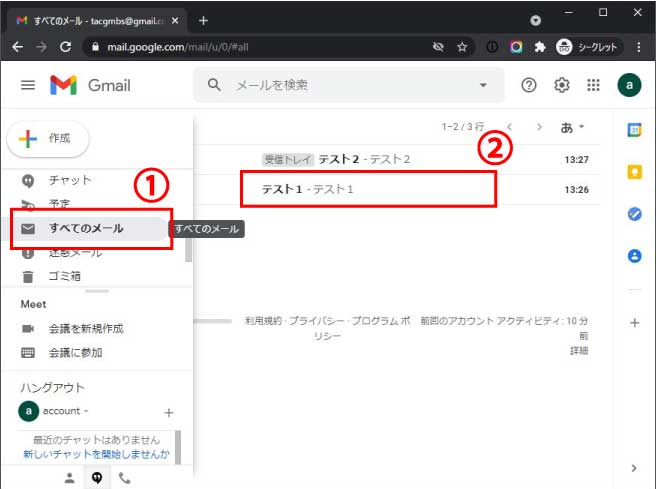 ②しかし、左のメニューから「すべてのメール」(①の部分)をクリックすると、ちゃんと「テスト1」というメールを見返すことができる(②の部分)ことがわかります。