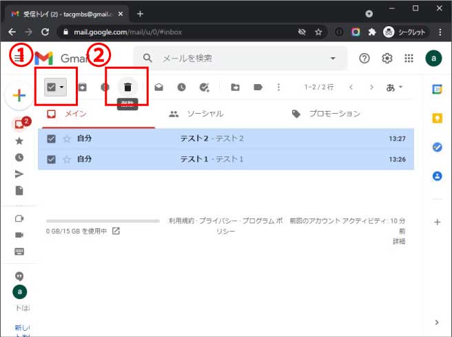 ②画面上部の①の箇所をクリックしてメールを一括選択し、②のゴミ箱マークをクリックすると、一括でメールが削除できます。
