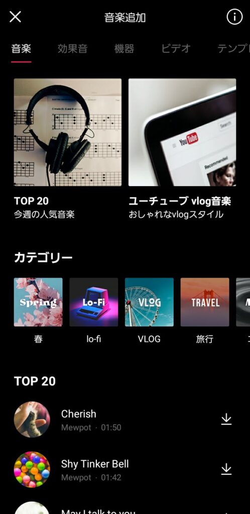また、動画に使用する音声を選ぶページ (※上の写真右側)が使いやすく、様々なカテゴリー、TOP20などの項目からクオリティの高い音楽や効果音を選ぶことができるのは大きなメリットだと言えます。