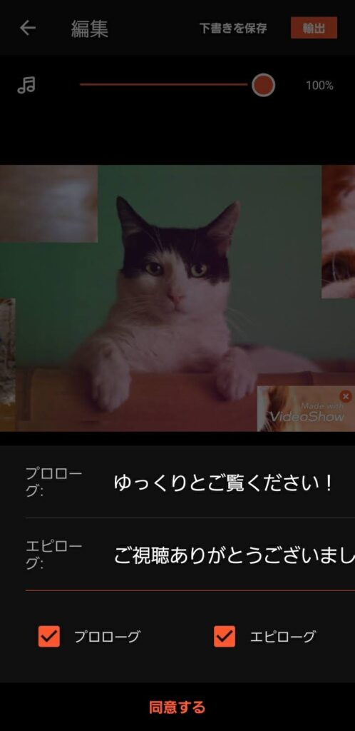 さらに写真右側のように、動画のプロローグ(開始部分)とエピローグ(終了部分)に表示する文字もテンプレートにそって入力するだけで作成できるのがVideoShowのメリットです。