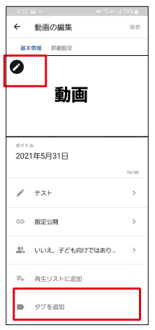 ⑥タグも同様に動画の編集画面の下部「タグを追加(画像赤枠部分)」から設定すれば完了です。
