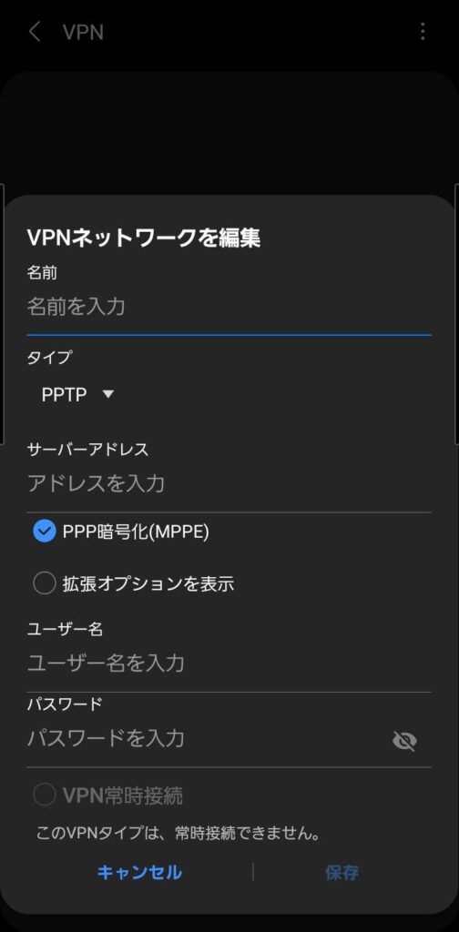 VPNのネットワークを編集する画面になったら、タイプをPPTPなどから選び、サーバーアドレス、ユーザー名とパスワードを入力して保存すればVPNをを利用することができます。