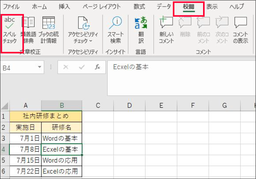 Excelでは誤字脱字がないかの確認(スペルチェック)を手動で行うことができます。