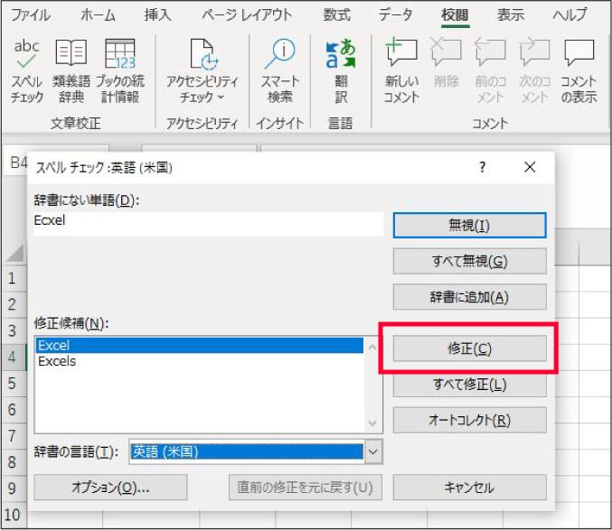 ④左側の「修正候補」の中で正しい候補を選び、「修正」をクリックすれば完了です。(この例の場合「Ecxel」が「Excel」に変わります)