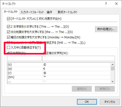 ③「入力中に自動修正する」のチェックボックスを外し、「OK」をクリックすれば完了です。