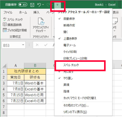 例:「スペルチェック」を クイックアクセスツールバー に追加する場合