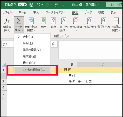 ① 日付を入力するセルを選択し、「数式→オートSUM→その他の関数」の順に選択します。