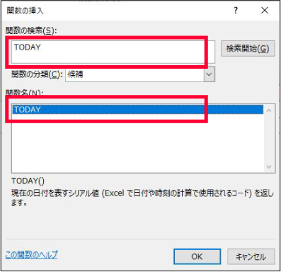 ②「 関数の検索」という部分に「TODAY」と入力して、「検索開始」をクリックします。