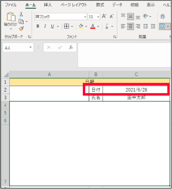 そして、このExcelファイルを明日(6月29日)に開くと、赤枠の部分が2021/6/29に自動的に変わるという設定ができます。