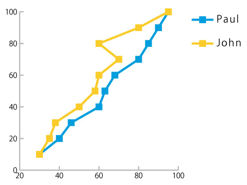 主に2つのデータの比較に使われます。相関関係を視覚的に把握できるのでそれぞれの関係性の理解を促します。