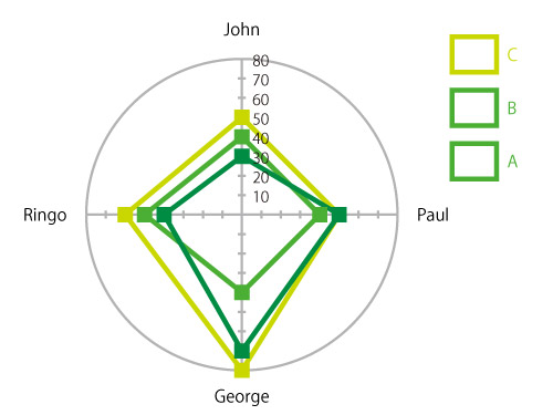 外に行くほど高い数値になるので棒や折れ線にはない比較の仕方ができます。