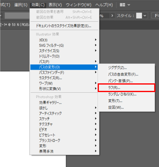 1.上部メニューから「効果」→「パスの変形」→「ラフ」ツールを開く