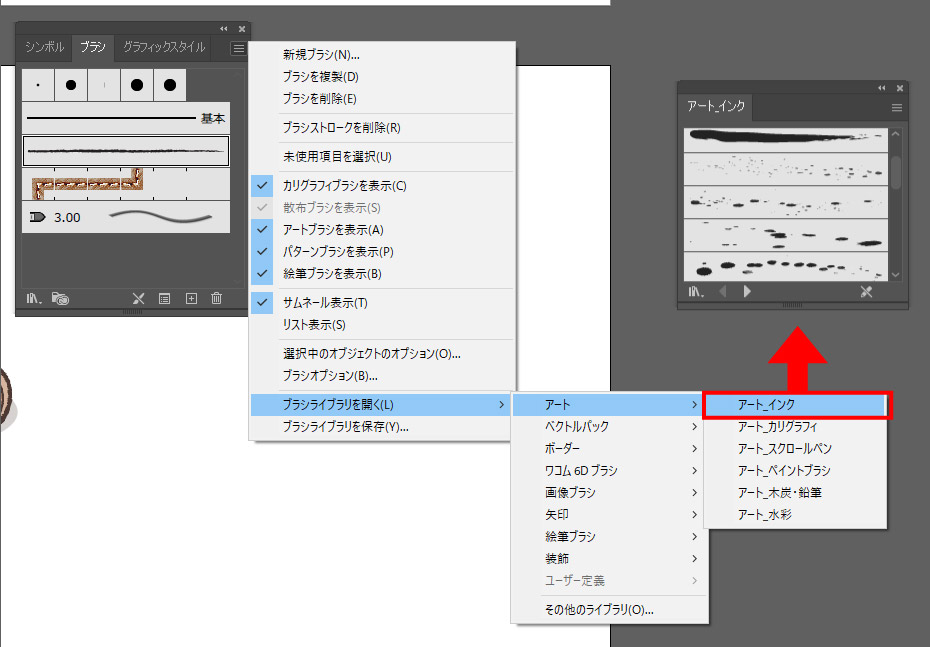 2.ブラシウィンドウの右上にある「三」を押し、「ブラシライブラリを開く」→「アート」→「アート_インク」を開く