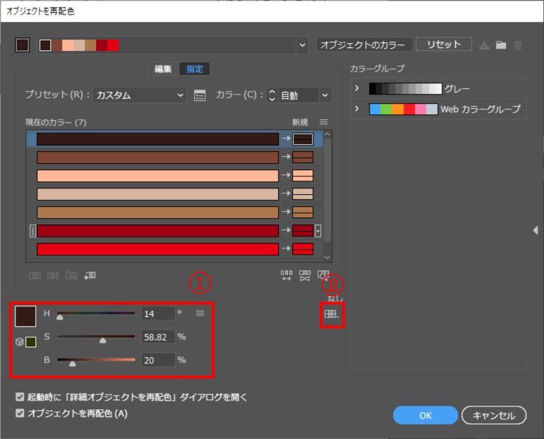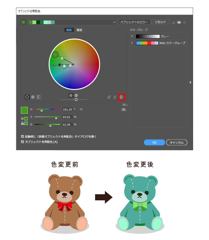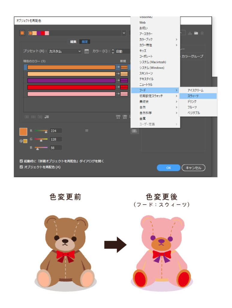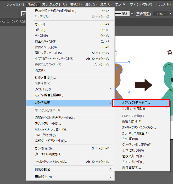 1.上部メニュー「編集」→「カラーを編集」→「オブジェクトを再配色」を開きます。