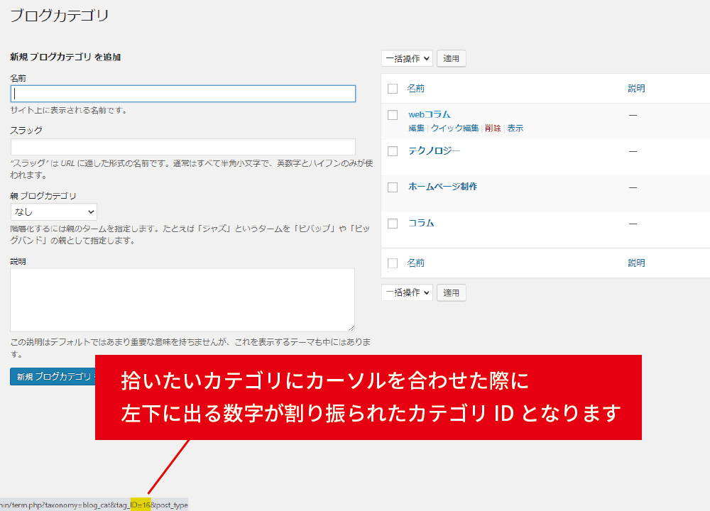 拾いたいカテゴリにカーソルを合わせた際に 左下に出る数字が割り振られたカテゴリIDとなります。