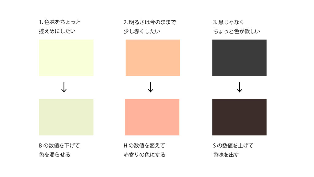 Hで赤、黄、青といった色を決め、Sでちょっと濁らせて落ち着いた感じにして、Bで明るくして軽めの色に仕上げるといったイメージです。