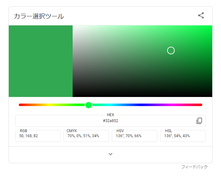 RGBだけではなく、CMYKまで網羅していてコードまで表示されます。どんな用途でも対応できることはもちろん、検索するだけですぐに使える便利なツールです。