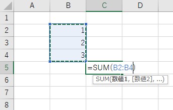 「B列の2からB列の4に入っている数字の合計をここに表示してね」という指示が自動で入ります。