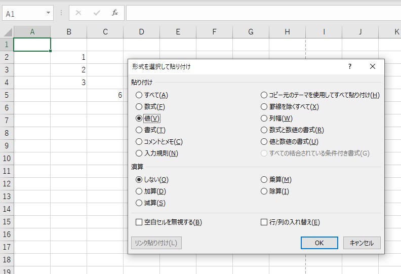 このようにダイアログが表示されるので、あとは自分が貼り付けしたい形式を選択します。(今回は値だけコピーしたいので「値」を選択)