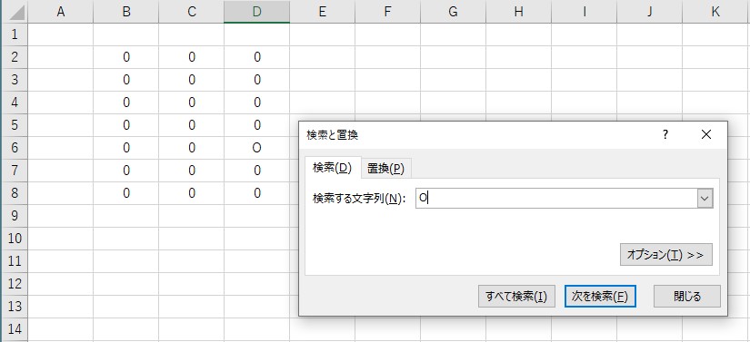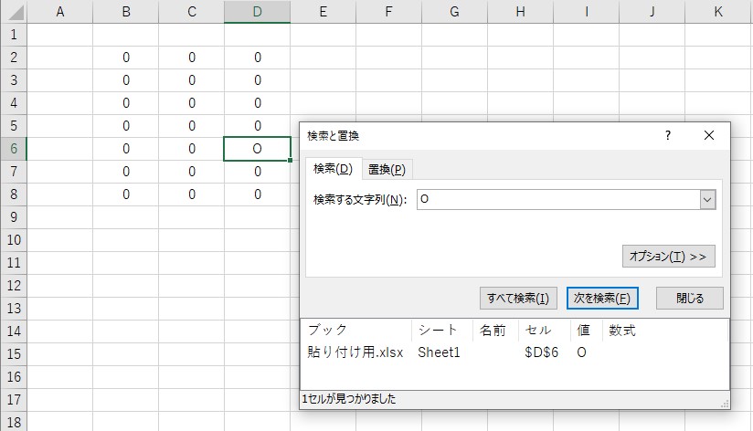 D-6に四角が移動して、「O」が入力されていることがわかりましたね!結果に該当するものが複数ある場合でも、きちんと表示されます。