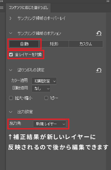 実は「コンテンツに応じた塗りつぶし」でサンプリング領域まで調整できるのは、CC 2019からの新機能です。Photoshopを含めAdobeのソフトは毎年どんどん進化し、便利になっています。