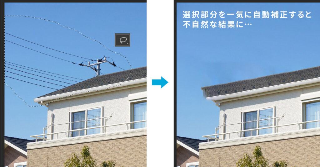 「なげなわツール」で、屋根を含まない電線部分を選択し、「コンテンツに応じた塗りつぶし」をクリック。