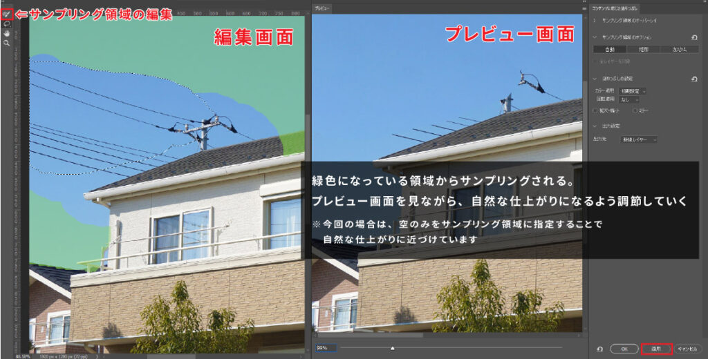 応用編!手動でサンプリング領域を調節し、電線を消してみる
