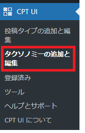 その後、上の画像の赤枠で囲ってある、「タクソノミーの追加と編集」をクリック