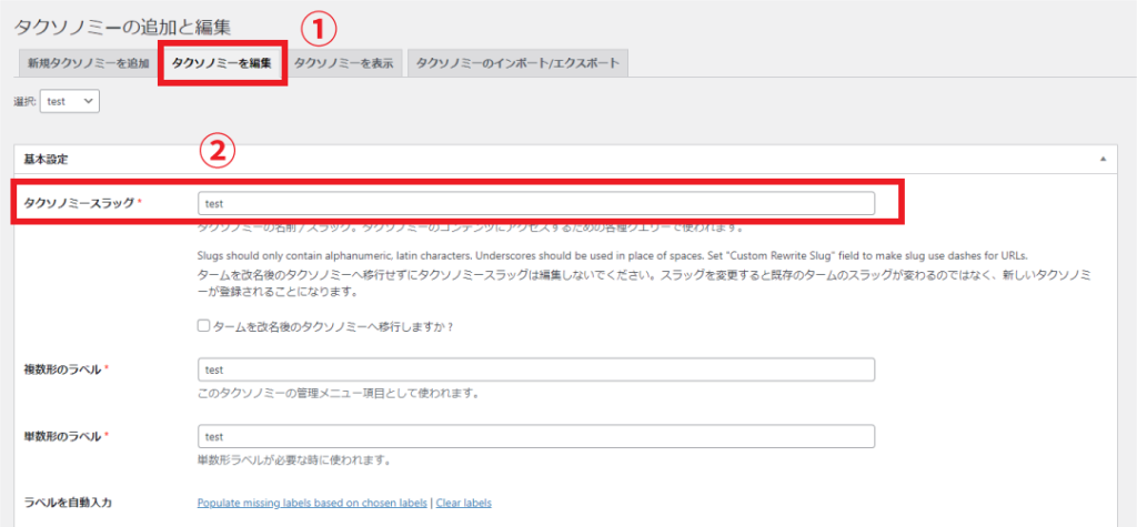 そして、上の写真の赤枠①の「タクソノミーを編集」をクリックしたら、