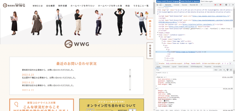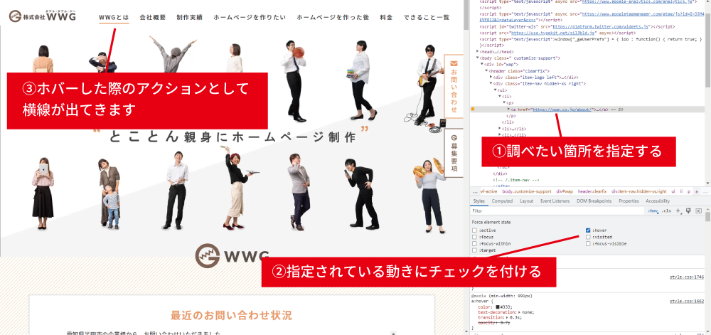 今回は、基本的な事ですがホームページのホバー時のCSSを確認したい場合の方法をご紹介したいと思います。