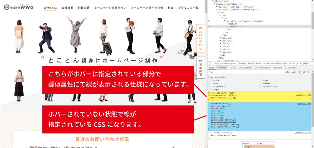 ホバー時のアニメーションを確認する際に知っておかないとどこの部分のCSSで指定されてるか特定が困難になり時間がかかってしまう為、知っておくだけで効率が上がります。