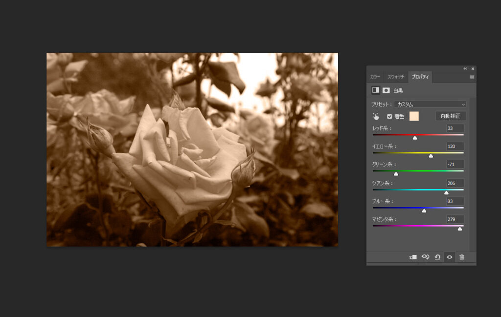赤いバラの場合「レッド系」の数値を減らして濃くしたり、増やして白いバラのように明るくすることが可能です。