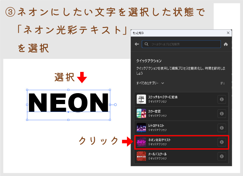 ネオンにしたいテキストを「選択ツール」で選択した状態で、「ネオン光彩テキスト」を選択します。