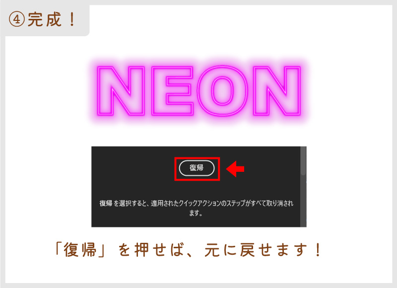 この機能は従来ネオン文字を作るときに、少しずつ設定していたアピアランス設定をすべて省略して、ワンクリックでネオン文字が作れてしまうすごい機能です!