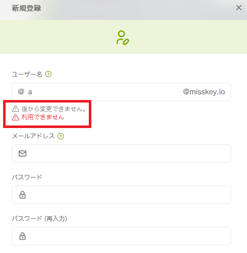 登録できない方は、使用できないユーザー名(他者がすでに使っている文字列)を入力している可能性があります。数字などを組み合わせて、ほかの方と被らないようなものにしてみてください。