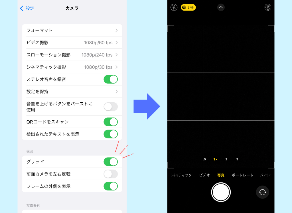 設定アプリ→カメラ→グリッド