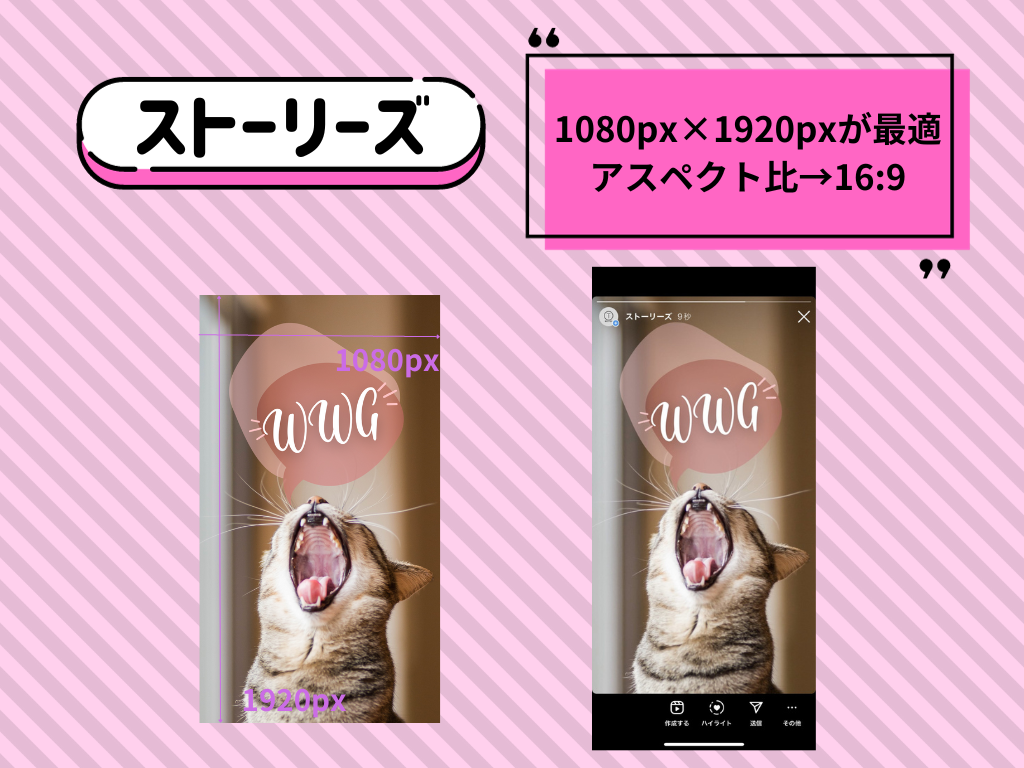 ストーリーズでは、動画も画像も投稿可能ですが、リールと同じように16:9の縦長で投稿すると、スマートフォンでは全面表示になるのでおすすめです。