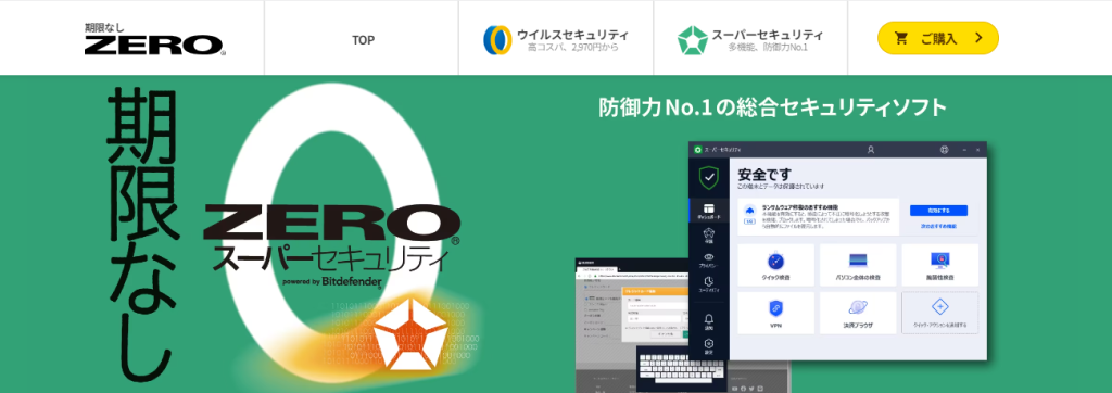 ほとんどのセキュリティソフトが、1年から数年更新なのに対して、ZERO スーパーセキュリティは買い切りという点が一番の特徴です。
