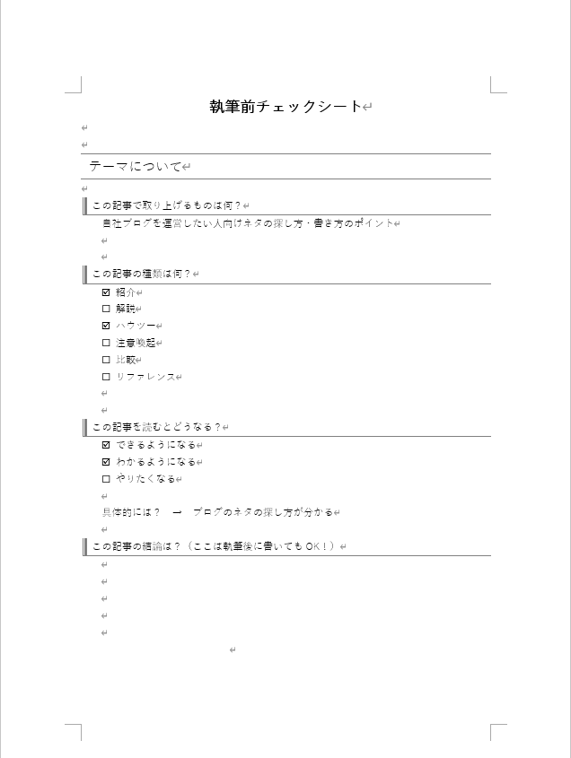 WWGのライターの場合は、事前に「執筆前チェックシート」というもので構成を考えてから執筆に入ります。