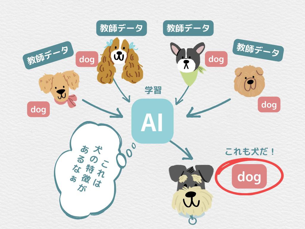 「これは犬だよ」とタグを付けてあげた「教師データ」をもとに、AIが学習を行うと、AIは「犬」のパターンやルールを見つけて、タグがないデータを見ても「犬だ!」と分かるようになるのです。