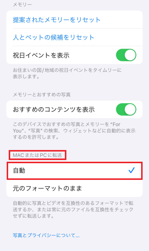 そして、一番下にある「MACまたはPCに転送」で「自動」にチェックします。
